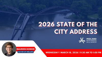 Join us for a Membership Lunch featuring Midland Mayor Maureen Donker's annual State of the City address. This signature event brings together community leaders, businesses, and residents to reflect on our city's achievements and future. Be part of the conversation, celebrate our community, and stay informed on the latest city developments.